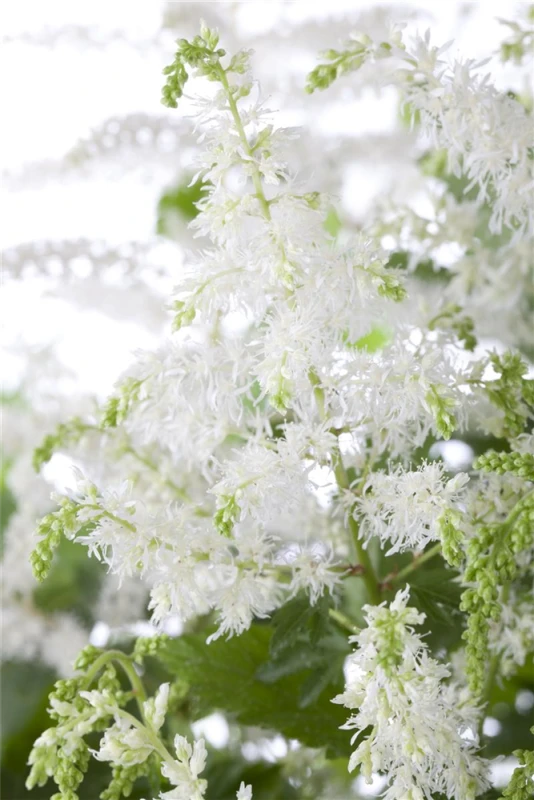 Astilbe x arendsii ‚Brautschleier‘ bildet in Rispen angeordnete, weiße Blüten ab Juli.