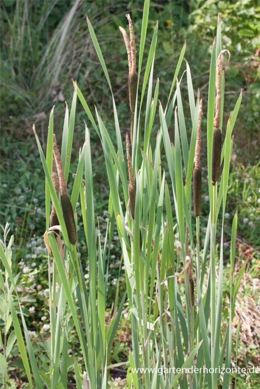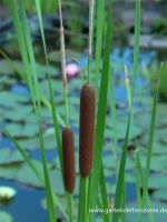 Der Breitblättriger Rohrkolben (Typha latifolia) ist mit seinen dunkelgrünen Blättern eine ausgesprochen dekorative Wasserpflanze, die für solche Einsatzbereiche wie Sichtschutz, Schnitt, Teichrand und Bachlauf besonders gut geeignet ist. Die Blüten erscheinen, je nach Sorte, in vielen Farben von Juli bis August. Er bevorzugt humosen, nährstoffreichen Boden in sonniger Lage. Der Breitblättriger Rohrkolben ist gut frostverträglich. Die aufrechte, ausläuferbildende Staude erreicht gewöhnlich eine Höhe von ca. 2,5 m.