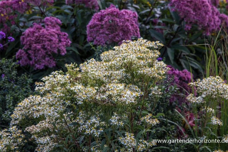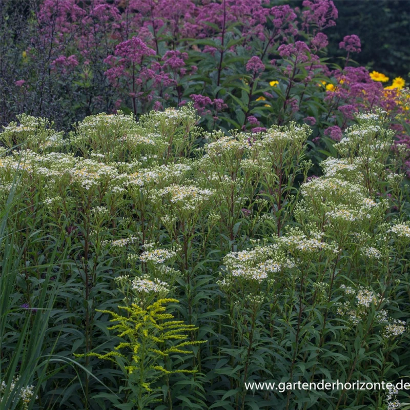 Die Doldige Garten-Aster ‚Weißer Schirm‘ setzt schöne Akzente gemeinsam mit: