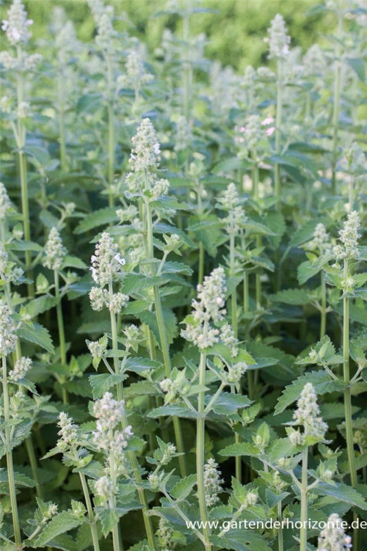 Nepeta cataria ‚Citriodora‘ bildet lippenförmige, in Ähren angeordnete, weiße Blüten ab Juli.