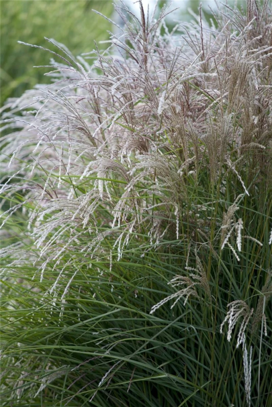 Das Garten-Chinaschilf ‚Federweißer‘ (Miscanthus sinensis) ist mit seiner mittelgrünen Blattfärbung ein dekoratives Gestaltungselement im Garten, welches sich an einem sonnigen Standort mit einem möglichst durchlässigen, humosen, nährstoffreichen Boden am wohlsten fühlt. Die cremeweißen bis braunen Blütenwedel schmücken die aufrecht wachsende Pflanze ab Sommer. Bei günstigen Bedingungen erreicht dieses winterharte Gras eine Höhe von ca. 1,8 m und wird bis zu 1,5 m breit.