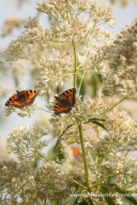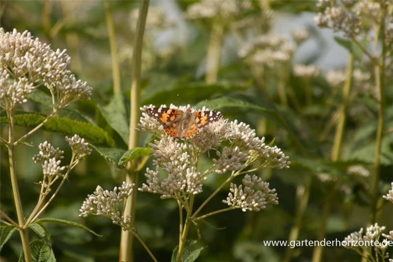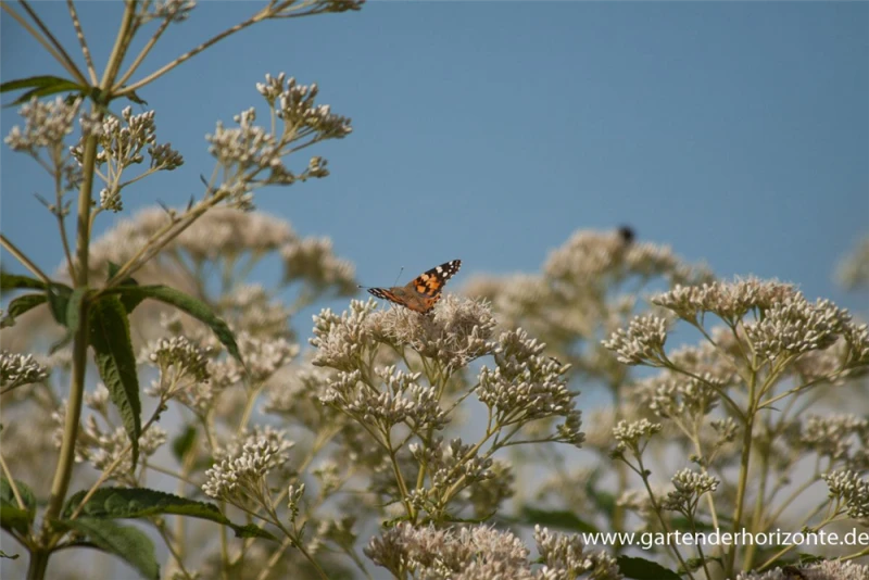 Der Große Garten-Wasserdost ‚Album‘ (Eupatorium fistulosum) ist eine aufrechte Staude, die von Juli bis September weiße, in Doldentrauben angeordnete Blüten mit einem angenehmen Duft bildet. An einem sonnigen bis halbschattigen Standort mit durchlässigem, nährstoffreichem Boden erreicht er gewöhnlich eine Höhe von ca. 1,8 m und wird ca. 1 m breit. Der Große Garten-Wasserdost ‚Album‘ ist gut frostverträglich.