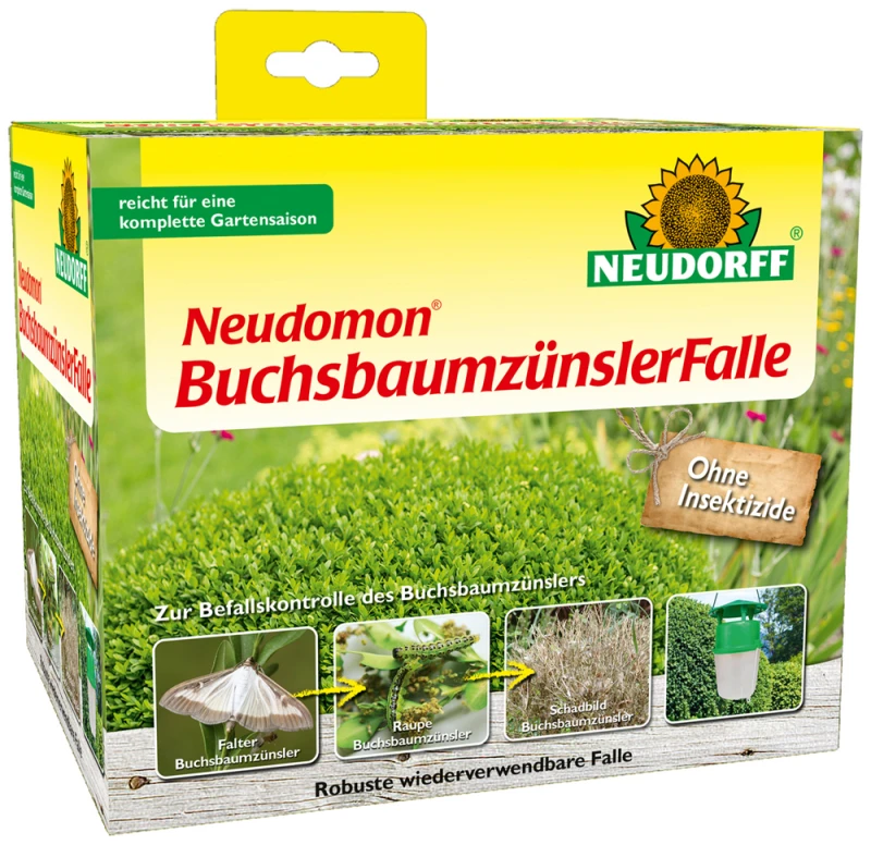 Biotechnische Falle mit Sexuallockstoff zur Minderung des Befalls von Buchsbaumzünslern bzw. zum Monitoring. Ideal für die Ermittlung des günstigsten Spritztermins mit einem zugelassenen Pflanzenschutzmittel.